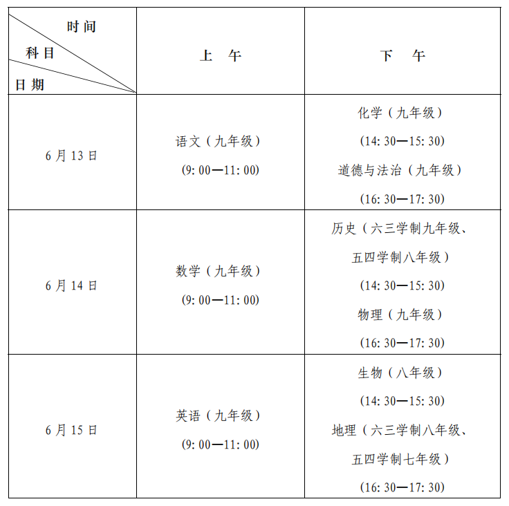 各区县教体局,直属各学校(事业单位),机关各处室: 现将《济南市2026年初中学生毕业评价及学业水平考试实施意见》印发给你们,请认真贯彻执行。 济南市教育局办公室 2026年3月31日 (此件公开发布) 济南市2026年初中学生毕业评价及学业水平考试实施意见 为全面贯彻党的教育方针,深化基础教育综合改革,促进学生健康全面发展,现对济南市2026年初中学生毕业评价及学业水平考试(中考)工作提出如下意见。 一、义务教育阶段初中学生毕业评价 初中学生毕业评价结果由学生综合素质评价和学业水平考试两部分组成。 (一)综合素质评价。学生的综合素质评价包括品德发展、学业发展、身心发展、审美素养、劳动与社会实践等五方面;以“等级+描述性评价”的方式呈现,以一个学期为一个评定时段;学校根据学生各个学期的评价结果,按照学校综合素质评价方案,计算学生终结性评价结果,以A、B、C、D、E五个等级确定该生综合素质评价总评成绩,评价结果由学生和家长签字确认。综合素质评价工作由市教育局统筹,各区县教育行政部门负责管理和监督,各初中学校负责组织实施,评价的标准、办法、过程、结果等要全过程公开、公示。 (二)学业水平考试。初中学业水平考试是义务教育阶段的终结性考试。考试成绩是初中学生毕业及升学的主要依据,除教育行政部门批准的参加自主招生提前录取的学生外,未参加初中学业水平考试的学生不得领取《义务教育证书》。 1.考试考查科目。初中学业水平考试范围覆盖国家义务教育课程方案规定的所有科目,其中语文、数学、英语、物理、化学、道德与法治、历史、体育与健康、生物、地理、信息科技等学科为考试科目,综合实验操作、艺术(含音乐、美术等,下同)、综合实践活动(含劳动,下同)等为考查科目。 2.成绩表达形式。初中学业水平考试分数评价部分的总成绩为660分。其中,语文、数学、英语各150分(英语学科含听力测试30分),均按原始得分计入总成绩;物理90分、化学60分,分别按照卷面得分(满分均为100分)的90%和60%计入总成绩,物理、化学均单科计分,四舍五入,不保留小数;体育与健康60分,具体考试及计分办法另文发布。 道德与法治、历史、生物、地理学科采用等级评价方式,依据全市(不含莱芜区、钢城区)实考考生成绩由高到低划定为A、B、C、D、E五个等级;莱芜区、钢城区依据两区实考考生成绩单独划定为A、B、C、D、E五个等级。各等级人数所占比例为:A等级15%、B等级30%、C等级30%、D等级20%、E等级5%。因考生同位次情况超出等级划定比例时,按相邻等级的较高等级划定。 信息科技、综合实验操作、艺术、综合实践活动采用等级评价方式,分为“合格”“不合格”两个等级。 3.部分学科补考、重考条件。应届考生因故未参加当年生物、地理学科考试的,在九年级毕业前允许有一次补考机会,补考成绩按照首次考试成绩认定标准认定。生物、地理学科考试等级为D级(含)以下等级的考生(含往届生),本着自愿的原则,可参加生物、地理学科的重考,重考后的最高等级为C级(含)。 二、初中学业水平考试考务组织 (一)考试形式 初中学业水平考试实行“学完即考”,初中学校根据课程设置方案组织学生参加相应学科考试。原则上,五四学制的七年级学业水平考试科目为地理,八年级学业水平考试科目为历史、生物、信息科技,九年级学业水平考试(考查)科目为语文、数学、英语、物理、化学、道德与法治、体育与健康、综合实验操作、艺术和综合实践活动。六三学制的八年级学业水平考试科目为生物、地理、信息科技,九年级学业水平考试(考查)科目为语文、数学、英语、物理、化学、道德与法治、历史、体育与健康、综合实验操作、艺术和综合实践活动。 语文、数学、英语、物理、化学、道德与法治、历史、生物、地理、体育与健康考试评价工作由济南市教育招生考试院统一组织实施。信息科技、综合实验操作、艺术和综合实践活动等考试(考查)科目的评价工作,根据招生考试有关要求,在各区县教育行政部门指导下,由各初中学校负责组织实施。 (二)考试时间 具体考试时间安排如下。 (三)考点设置 初中学业水平考试考点设置及考试组织由济南市教育招生考试院和区县招生考试机构负责实施。 (四)考试报名 1.报名方式:初中学业水平考试实行网上报名。 2.报名资格:凡具有我市初中学籍的或具有我市户籍在外地就读的七年级(五四学制)、八年级、九年级学生,均可报名参加相应年级的初中学业水平考试。具有高中阶段学校学籍或学历的学生不得报名。往届生报名工作由学籍所属的区县教育行政部门负责,外地返济学生的报名工作由户籍所属的区县教育行政部门负责。 3.注意事项:参加九年级学业水平考试且学籍、户籍分属济南市不同区县的考生报名时,在规定时间确认以户籍或学籍所在地考生身份参加济南市高中阶段志愿填报,一经确认,不得更改。 (五)命题要求 坚持正确的政治方向,全面贯彻党的教育方针,引导学校全面发展素质教育,引导学生树立正确的世界观、人生观和价值观,促进学生德智体美劳全面发展。严格依据义务教育课程标准命题,科学合理设置试卷难度和试题结构,有效考查学生综合素质。 (六)考试经费 根据相关规定,我市初中学生学业水平考试的支付项目、标准及所需费用全