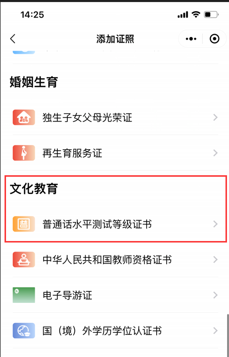 4.在添加证照页面,往下滑动,在“文化教育”大类中,点击“普通话水平测试等级证书”。