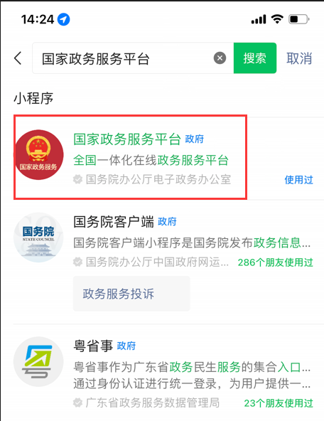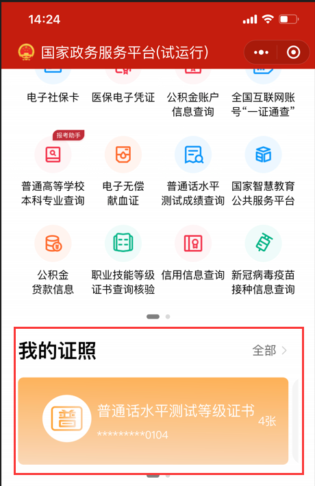 根据2022年1月1日起实施的《普通话水平测试管理规定》(教育部令51号)第十五条规定,普通话水平测试等级证书分为纸质证书和电子证书,二者具有同等效力。纸质证书由国务院语言文字工作部门统一印制,电子证书执行《国家政务服务平台标准》中关于普通话水平测试等级证书电子证照的行业标准,纸质证书遗失的,可以通过国家政务服务平台查询测试成绩,查询结果与证书具有同等效力。 考生可通过支付宝、微信小程序搜索“国家政务服务平台”查询本人普通话水平测试电子证书。特别提醒,本办法只适用于机辅测试的普通话水平等级证书。 以微信小程序为例,查询方法如下: 1.微信页面下拉进入小程序页面,点击“搜索小程序”,进入搜索页面,在搜索框内输入“国家政务服务平台”,搜索并进入。